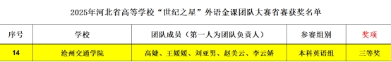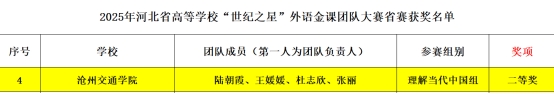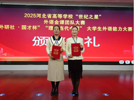 2025年11月8日,河北省高等学校“世纪之星”外语金课团队大赛总决赛于邯郸学院成功举办,本次赛事由河北省教育厅主办,河北省高等学校外语教学指导委员会、河北省高等学校外语教学研究会和外语教学与研究出版社联合承办。我校外国语学院选派陆朝霞老师团队以及高婕老师团队分别参加“理解当代中国”组及“本科英语组”两个赛道的比赛,最终斩获省级二等奖1项和三等奖1项,有力展现了学校外语教师出色的教学素养与风采。