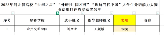 外国语学院商务英语2201班刘金龙同学(指导老师王媛媛)在英语口译比赛中脱颖而出,获得省级铜奖。