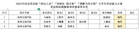 在英语组短视频赛项中,外国语学院英语2308班的韦雨萌、王紫萱,英语2302班的杨亚杰(指导教师陆朝霞);外国语学院商英2401班的焦俊哲、王珊珊、张艺萱,商英2402班的孙启硕(指导教师王璐瑶)以及计算机与信息技术学院数据科学与大数据2301班的曹榕芳、经济管理学院金融工程2408班的刘键、计算机与信息技术学院软件工程2408班的韩博文(指导教师孙杰)三支队伍获得了省赛铜奖,其作品内容丰富,画面精美,形式独特,赢得了评委的一致好评。