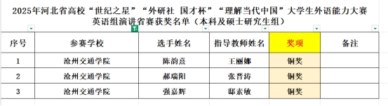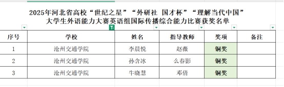 同时,外国语学院英语(专升本)2504班的李晨悦同学(指导教师赵薇)、土木工程学院建筑环境与能源应用工程2401班的孙含冰同学(指导教师么春影)和经济管理学院金融工程2401班的牛晓慧同学(指导教师邓倩)获得铜奖,展示了他们全方面的英语综合能力。