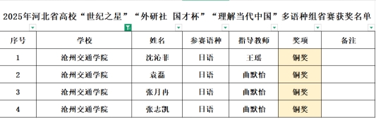 在多语种赛项日语省赛中,经济管理学院物流管理2502班的沈沁菲(指导教师王瑶),土木建筑工程学院工程造价2203班的袁磊、经济管理学院金融工程2305班的张月冉、轨道交通学院轨道交通信号与控制2511班的张志凯(指导教师曲默怡)荣获了省级铜奖,他们的出色表现凸显了外国语学院日语教学的风采。