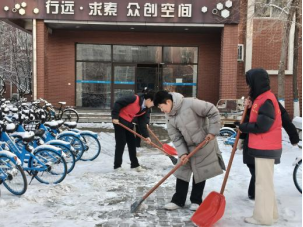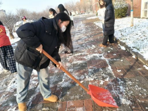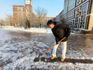 外院学子分工协作,有的手持铁锹铲除路面厚雪,有的奋力敲碎顽固积冰;有的清理人行道残雪,有的规整积雪堆放区域。忙碌的身影穿梭在冬日的夕阳下,构成一道别样的风景线。经过近两小时的协同奋战,通方楼门前通道及第一实验楼周边步道的积雪积冰被彻底清理干净。师生手中的铁锹铲走了路面的冰雪,更传递出“以行动暖校园”的温情与温度。