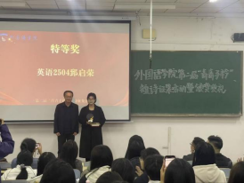 张丽老师为一等奖获得者颁奖后,两位获奖同学分享了创作心得。特等奖由英语2504班郅启荣同学凭借作品《欢畅饮风到》获得,束光辉院长为其颁奖,郅启荣同学随后进行了现场朗诵。
