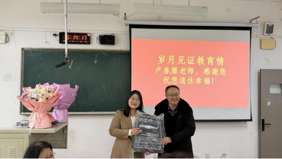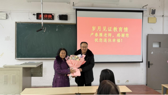 活动伊始,外国语学院束光辉院长致词,高度赞扬卢春雁老师长期坚守教学一线,以初心育人、以匠心执教,是学院发展的见证者、推动者,更是师生心目中的楷模。束院长代表校人事处与工会,向卢老师赠送水晶奖杯、纪念书包及鲜花,表达深切敬意与美好祝愿。
