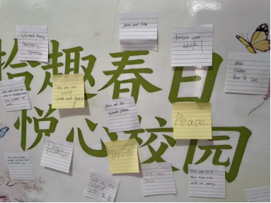 最后一个游戏“和平心愿便利贴”,为活动注入最温暖的仪式感。三个游戏结束后,同学们在便利贴上写下对和平最真挚的心愿,随后依次将心愿贴在“和平心愿板”上。短短几分钟,心愿板便被密密麻麻的便利贴填满。一句句心愿,是同学们对和平最赤诚的期许,也成为本次英语角最珍贵的纪念。