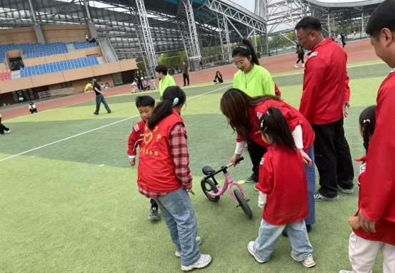 趣味运动会正式开展后,志愿者们化身孩子们的“得力帮手”,全程协助老师们完成各项活动组织工作。在平衡车赛道旁,他们辅助引导孩子有序参与;在趣味充气游戏区,他们帮忙整理道具、维护秩序;面对需要帮助的孩子,他们主动上前牵起小手,协助老师完成分组、道具分发、现场引导等任务,用温柔的陪伴与高效的协作,保障了活动的有序推进,也让孩子们在轻松愉快的氛围中尽情享受运动的快乐。